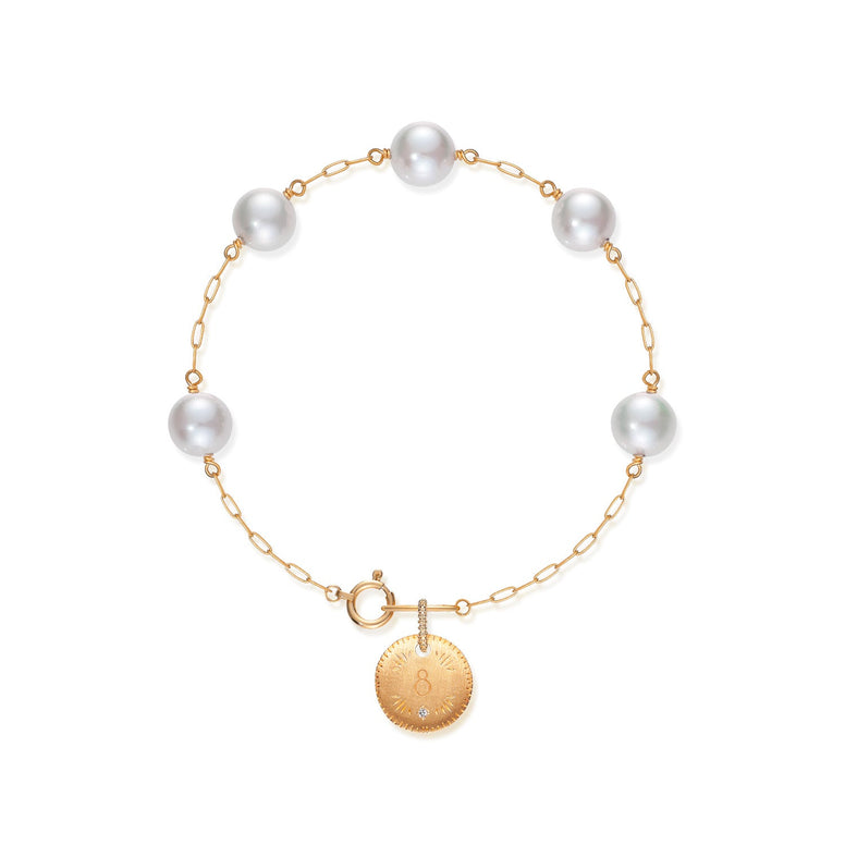 細かなディテールがポイントの、こだわりのオリジナルパーツ「ミルストライプ」 とクラフトコインがあこや真珠と美しく調和します。身に着ければ、きっと胸が高鳴り、あなたのパートナーとして日常に彩りを与えてくれるはず。チェーンは細すぎず、太すぎず。シンプルながらもしっかりとファッションのアクセントになるものをチョイス。贅沢にあこや真珠を配した、ステーションタイプのブレスレットです。